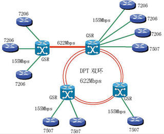 Switch Router 12000), 其中三個GSR之間采用Cisco的動態(tài)IP光纖傳輸技術DPT,采用兩個STM-4光纖環(huán)連接,利用SRP技術,使得STM-4在兩個環(huán)上實現(xiàn)負載均衡,這樣,主干網(wǎng)絡連接可以實現(xiàn)自我冗余保護,保證網(wǎng)絡主干連接在其中一條出現(xiàn)故障時,另外一條可以在很短的時間內(<50ms)接管數(shù)據(jù)負載。另一個GSR與DPT環(huán)之間采用STM-4的POS接口相連接。