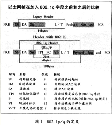 Identifier,虛擬網(wǎng)標識)位識別傳送的幀究竟屬于哪一個虛網(wǎng)。VI位共有12位,最大可以支持的虛網(wǎng)個數(shù)不會超過4096個。 802.1p/q的具體定義可以參見圖1。
