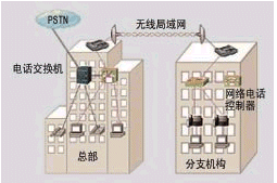 如圖2所示,兩個(gè)辦公樓之間距離較遠(yuǎn),不方便布線,其計(jì)算機(jī)網(wǎng)絡(luò)可以通過無線局域網(wǎng)來連接。在總部已有電話交換機(jī)系統(tǒng),這時(shí)只需在分支機(jī)構(gòu)中增加Cisco網(wǎng)絡(luò)電話控制器,布署IP電話機(jī),然后通過總部帶語音模塊的Cisco路由器或交換機(jī),接入總部的電話交換機(jī),分支機(jī)構(gòu)就可以享用總部的電話中繼線路,與總部一樣自由地使用電話系統(tǒng)。