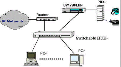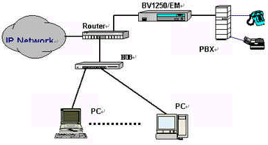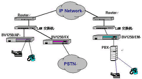 OKI公司的IVG BV1250互聯(lián)網(wǎng)絡(luò)IP電話語(yǔ)音網(wǎng)關(guān)就是一種非常好的選擇,完全基于H.323 Ver2.0協(xié)議,實(shí)現(xiàn)語(yǔ)音和傳真在因特網(wǎng)上傳輸。使用BV1250 進(jìn)行IP電話和IP FAX通信時(shí),可以感覺(jué)到與傳統(tǒng)的電話或傳真所提供的服務(wù)毫無(wú)區(qū)別。運(yùn)用BV1250,可通過(guò)互聯(lián)網(wǎng)(Internet/Intranet)將電話機(jī)、傳真機(jī)和PBX進(jìn)行互連,建立專(zhuān)用的IP電話網(wǎng)絡(luò)。BV1250使用的是靜態(tài)IP地址,因此不能將BV1250連接到使用DHCP(動(dòng)態(tài)主機(jī)通信規(guī)程)的互聯(lián)網(wǎng)上。常用連接方式如下圖所示: