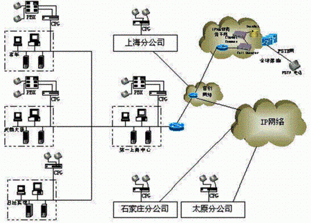 方案中VoIP的應用是比較典型的,同時也有比較特殊的地方:溫州、石家莊等地區(qū)沒有被首創(chuàng)網(wǎng)絡覆蓋到,而客戶仍想采用IP電話方式,據(jù)此首創(chuàng)網(wǎng)絡提出了部分通過公網(wǎng)Internet傳輸數(shù)據(jù)的個性化方案以滿足客戶的需求。