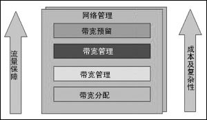 如圖所示,網(wǎng)絡(luò)管理貫穿于四個模塊建立過程中。特定的組件應(yīng)針對網(wǎng)絡(luò)基礎(chǔ)設(shè)施的特定部分而實施。具體實施時,應(yīng)首先從帶寬分配模塊開始,然后逐個上移。實施的模塊越多,保證的品質(zhì)會越高,但同時也增加了管理的復(fù)雜性,加大了維護成本。
