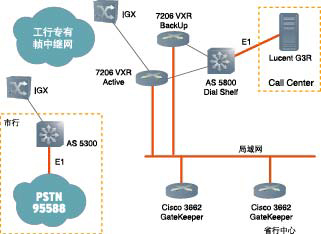 AS 5800 Dial Shelf上的E1接口直接連接客戶服務(wù)中心的Lucent公司G3R交換機(jī)。市行的語(yǔ)音網(wǎng)關(guān)Cisco AS 5300同樣通過(guò)高速串口接入幀中繼網(wǎng)絡(luò),與本地網(wǎng)絡(luò)完全隔離。市行申請(qǐng)的95588數(shù)字中繼線路(多采用ISDN