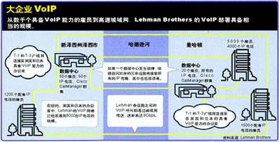 Lehman Brothers利用Cisco CallManager IP PBX向全球的雇員提供語音服務(wù)。該公司的IP PBX位于公司在曼哈頓和新澤西城的冗余數(shù)據(jù)中心內(nèi)。公司從2001年初先期部署了容量為50部電話的VoIP網(wǎng)絡(luò)。該系統(tǒng)在當(dāng)年年中時已經(jīng)增容至1000個用戶。目前,這套VoIP網(wǎng)絡(luò)已經(jīng)增加至8000個IP電話,用戶遍及紐約地區(qū)、英國和日本。該公司負(fù)責(zé)網(wǎng)絡(luò)服務(wù)的副總裁John