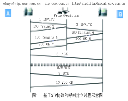 在Windows中內(nèi)置的NetMeeting就是典型的H.323協(xié)議客戶(hù)端,而比較常見(jiàn)的SIP系統(tǒng)是微軟開(kāi)發(fā)的MSN Messenger系統(tǒng)。一個(gè)簡(jiǎn)單的SIP協(xié)議呼叫建立過(guò)程如圖1所示。