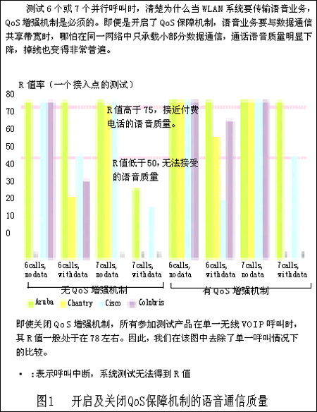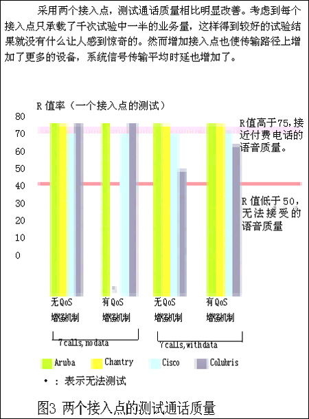 但我們這樣做是合理的。首先,Chantry和Colubris的設(shè)備甚至在建議內(nèi)的6個(gè)并行VoIP呼叫情況下,也無法正常通話。第二,Aruba的設(shè)備能夠處理7個(gè)并行VoIP呼叫并能適應(yīng)加入數(shù)據(jù)流業(yè)務(wù)的情況。第三,我們最有難度的試驗(yàn)也遠(yuǎn)低于無線傳輸媒介的最大負(fù)載。我們?cè)囼?yàn)通常低于3Mbps的通信傳輸速度(包括試驗(yàn)中的所有語音和數(shù)據(jù)業(yè)務(wù)),更遠(yuǎn)低于無線信道的容量了?傊,VoWLAN系統(tǒng)可以實(shí)現(xiàn)在單接入點(diǎn)承載7個(gè)并行VoIP呼叫并加入數(shù)據(jù)通信業(yè)務(wù),但要做到這一點(diǎn)需要更完善的系統(tǒng)設(shè)計(jì)和產(chǎn)品性能。