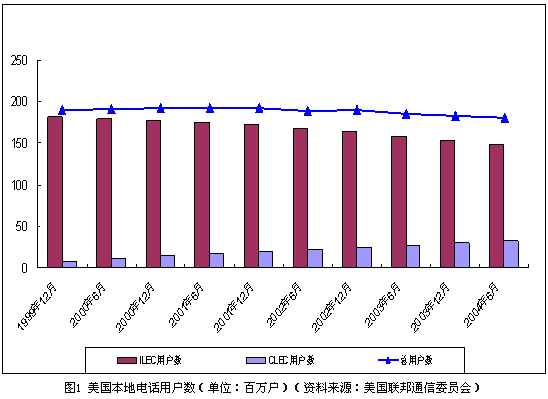 就整體而言,美國本地電話用戶總量穩(wěn)中有降,移動通信的替代作用開始顯現(xiàn)。截止到2004年6月,包括住宅和商業(yè)用戶,美國本地電話用戶總量達(dá)到1.81億戶。但與3年前相比,美國本地電話用戶數(shù)量實際減少了近1200萬戶。與此同時,移動用戶數(shù)量迅速增長。截止到2004年6月,美國移動電話用戶數(shù)比上年同期增長13%,達(dá)到1.673億戶,基本接近固定電話用戶的數(shù)量。