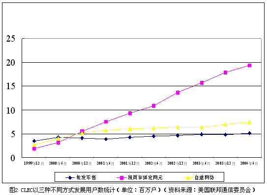 從經(jīng)營模式上看,本地非主導(dǎo)運營商的商業(yè)模式在過去的5年中發(fā)生了很大變化。在市場剛剛開始引入競爭的1999年,42.9%的本地非主導(dǎo)運營商選擇了批發(fā)零售這種進入門檻相對較低的商業(yè)模式,本地電話市場一度活躍著大量地區(qū)性的小運營商。由于面臨本地主導(dǎo)運營商的強烈抵制,非綁定網(wǎng)元政策的實施自公布以來一再推遲,經(jīng)過反復(fù)的法律訴訟,美國最高法院在2002年最終裁定非綁定網(wǎng)元政策合法。自那時起,AT&T、MCI等全國性的長途電話運營商紛紛通過租用非綁定網(wǎng)元的方式進入本地電話市場。截止到2004年6月,本地主導(dǎo)運營商已經(jīng)提供了約2150萬線非綁定本地用戶線給本地非主導(dǎo)運營商。CLEC以三種方式發(fā)展用戶的情況如圖2所示。