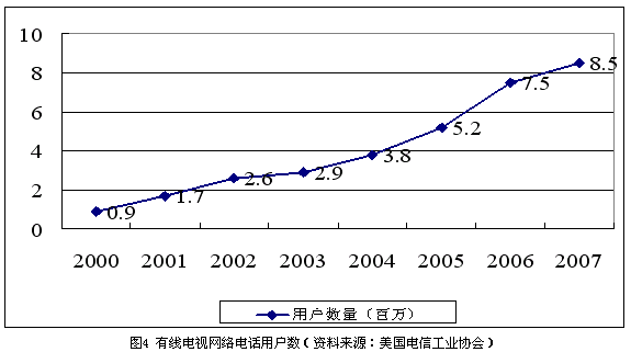 隨著有線電視用戶數(shù)量逐漸達(dá)到飽和,有線電視公司也在積極尋找新的利潤增長點。在過去的7年中,有線電視公司投入了高達(dá)800億美元的資金用于網(wǎng)絡(luò)升級改造,現(xiàn)在,大部分有線電視網(wǎng)絡(luò)已經(jīng)可以提供包括寬帶接入、本地和長途電話、數(shù)字電視、視頻點播等在內(nèi)的一攬子服務(wù)。到2004年末,有線電視公司已經(jīng)擁有超過380萬的本地電話用戶。根據(jù)美國電信工業(yè)協(xié)會的估算,到2007年,全美將會有超過800萬的用戶選擇基于有線電視網(wǎng)的基本電信業(yè)務(wù),如圖4所示。