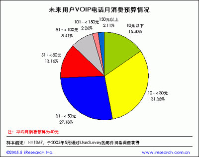 下面再讓我們看看用戶對網(wǎng)絡(luò)電話消費(fèi)預(yù)算情況,根據(jù)iResearch艾瑞市場咨詢《VOIP報告》數(shù)據(jù)顯示,月消費(fèi)預(yù)算10元以下的用戶占VOIP用戶的15%,10-30元的占31.3%,31-50元的占27.1%,51-80元的占13.2%,80元以上的占12.8%,據(jù)此計算未來用戶網(wǎng)絡(luò)電話平均月消費(fèi)預(yù)算為40元。