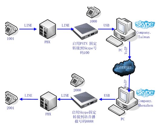 當臺北辦公室的一個員工(分機 1001)想與深圳辦公室的一個員工(分機2001)通話,他(她)撥打1000號分機,臺北側(cè)的ITA將該PSTN呼叫Forward到深圳的Skype(Company.
