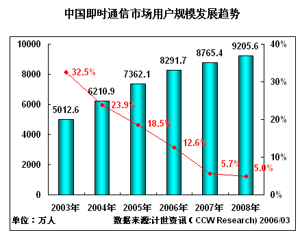 即時通訊巨大的市場價值主要來自三方面,除了能夠增加門戶網(wǎng)站的用戶的黏性,即時通訊能夠帶來巨大的用戶和網(wǎng)絡通訊巨大的市場。根據(jù)計世資訊《2005-2006年中國VoIP業(yè)務發(fā)展趨勢研究報告》相關數(shù)據(jù)顯示,2005年中國即時通訊用戶達到7362.1萬人,增長率為18.5%,2005年中國即時通訊市場規(guī)模達到16.2億元,實現(xiàn)37.3%的增長率。