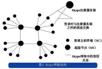 與常規(guī)的電信業(yè)務網(wǎng)絡不同的是,Skype的網(wǎng)絡中除了注冊服務器,沒有其他任何集中的服務器,只是將用戶節(jié)點分為普通節(jié)點和超級節(jié)點。Skype的系統(tǒng)連接結構如圖2所示。
