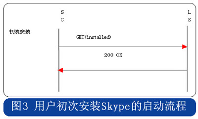Skype的用戶終端啟動時,采用HTTP協(xié)議連接到注冊服務器,用戶初次安裝的啟動流程中攜帶“installed”的參數(shù),使用時啟動流程則在消息中攜帶“getlatestversion”參數(shù),具體流程分別見圖3和圖4。