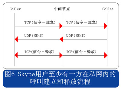 從上述流程圖可見,Skype的呼叫信令都采用TCP封裝,而媒體流則使用UDP封裝,當有任何一方用戶位于限制UDP包的防火墻內(nèi)時,媒體流就會采用TCP封裝。另外當Skype用戶至少有一方位于私網(wǎng)內(nèi)時,所有的信令和媒體消息都經(jīng)過一個或多個中間節(jié)點轉發(fā)。此時無需擔心用戶通話的媒體流因為經(jīng)過中間節(jié)點轉發(fā)而被竊聽,因為Skype采用了對消息進行端到端加密的機制。