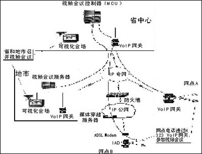 通過在全省部署VoIP系統(tǒng),網(wǎng)點VoIP網(wǎng)關可以通過H.245協(xié)議與視頻會議MCU(多點控制器)進行通信能力的動態(tài)協(xié)商,在國家、省和地市召開視頻會議時,網(wǎng)點可以通過普通電話(或者電話會議終端)參與會議,實現(xiàn)“聽聲參會”,低成本地實現(xiàn)了行業(yè)視頻會議系統(tǒng)的延伸。