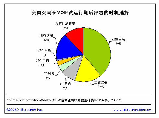 iResearch艾瑞市場咨詢整理《InformationWeek》對(duì)320位商業(yè)科技專家進(jìn)行的VoIP調(diào)研數(shù)據(jù)顯示,美國有近四成的公司在VoIP試運(yùn)行期后安裝了VoIP,正在安裝的也達(dá)到了一成以上,打算在6個(gè)月以內(nèi)安裝的有近一成。