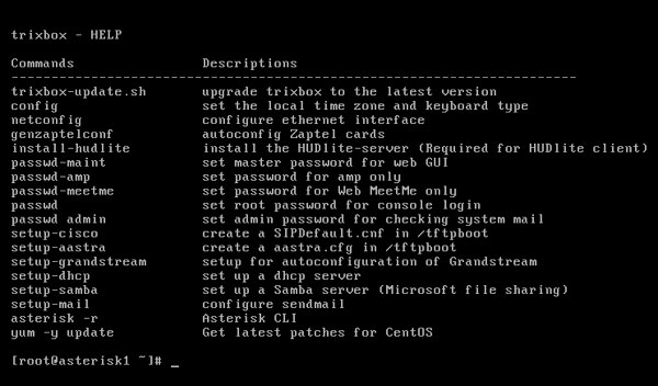 理論上,在安裝完成之后,用戶即可通過Web界面進(jìn)行配置,但是我們強(qiáng)烈建議用戶首先登錄進(jìn)入命令行界面,修改各組件相關(guān)的各個口令。使用help-trixbox功能,即可訪問Trixbox主要組件的管理、升級、維護(hù)和配置腳本,如圖1所示。其中,以“passwd”為開始的命令用于修改各主要管理界面的口令。此外,對于安裝了FXS/FXO語音卡的用戶,需要首先運(yùn)行g(shù)enzaptelconf腳本,生成基本的zaptel配置文本。需要提醒的是,用戶應(yīng)該慎用yum-update命令,因?yàn)樵撁钪粚entOS進(jìn)行常規(guī)更新,有可能會改變Asterisk相關(guān)的配置文件,使Asterisk在系統(tǒng)重新啟動之后無法正常運(yùn)行。