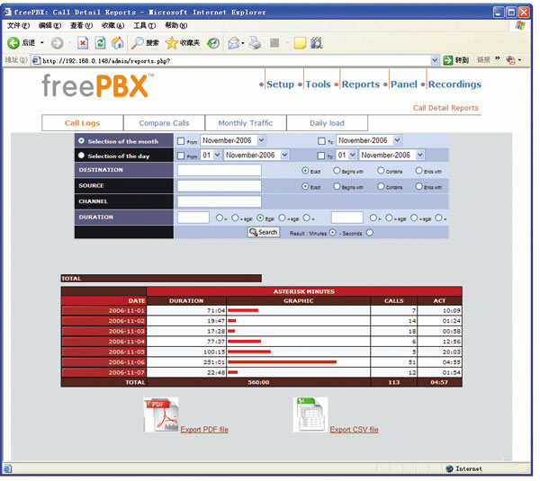 使用Trixbox的統(tǒng)計(jì)報告功能(如圖5所示),用戶能夠察看在一個時間段內(nèi)的通話統(tǒng)計(jì)數(shù)據(jù),例如呼叫建立總數(shù)、呼叫平均時長、失敗呼叫比例等等,當(dāng)然也能夠察看每個呼叫的主叫/被叫號碼,以及呼叫發(fā)生的具體時間。