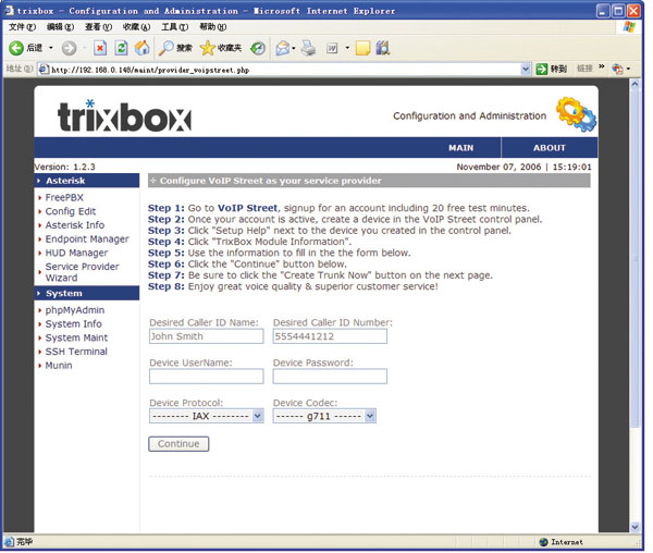 以往,我們使用一臺基于FreeBSD和Asterisk 1.2.4的PC機(jī)完成這個功能,在測試過程中,我們使用Trixbox,經(jīng)過簡單配置,很快就實(shí)現(xiàn)了原有功能。