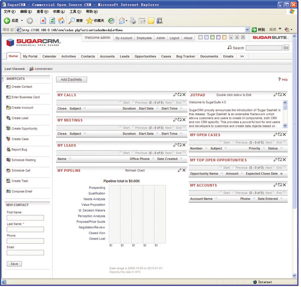 SugarCRM的默認(rèn)界面提供了個人門戶、日歷、事件、聯(lián)系人、機(jī)會管理、項(xiàng)目、問題追蹤、文檔等常用模塊,用戶還可以根據(jù)自己的需要增加新的模塊。當(dāng)前,SugarCRM已經(jīng)能夠較好地支持簡體中文,即使在英文界面中,也可以顯示和編輯中文字符,但在基于中文的排序方面尚未實(shí)現(xiàn)。另外,雖然SugarCRM提供了簡體中文語言包,但是只支持UTF-8編碼,在我們實(shí)測中發(fā)現(xiàn)會有亂碼問題,因此建議用戶還是選擇在英文界面中處理簡體中文。