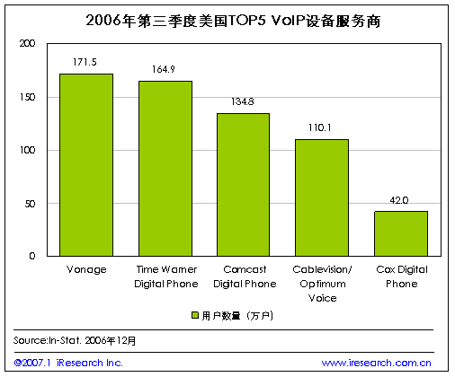 iResearch艾瑞市場咨詢根據(jù)In-Stat的統(tǒng)計數(shù)字整理發(fā)現(xiàn),目前在美國VoIP市場中,以VoIP設備為服務基礎的服務提供商的用戶數(shù)量來看,占市場主導位置的五大服務商為Vonage、Time Warner、Comcast、Cablevision/Optimum和Cox.