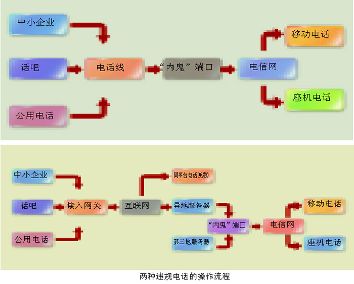 由于運營商在計費系統(tǒng)上執(zhí)行的是“固定電話被叫免費”、“移動電話接聽由移動運營商自行計費”的模式,這使得違規(guī)電話在跨運營商呼叫時,容易被忽略并且難以被追蹤。所以,他們的行動顯得相當(dāng)隱蔽,這也是為什么提供違規(guī)電話業(yè)務(wù)的公司,不嫌麻煩、層層轉(zhuǎn)接的原因所在。