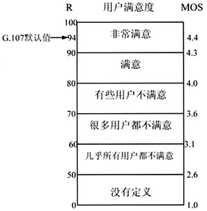 在ITU-T P.800中規(guī)定的平均主觀值MOS,基于該主觀評測把人接聽和感知語音質(zhì)量的行為被調(diào)研和量化,接聽到何種級別質(zhì)量的語音,就得到多少平均主觀值MOS。一般情況下MOS值是4或更高被認(rèn)為是比較好的語音質(zhì)量,而若平均主觀值MOS低于3.6,則大部分接聽者不能滿意語音質(zhì)量。平均主觀測試雖然準(zhǔn)確有效,但是這種方法存在的最大問題就是實(shí)現(xiàn)起來非常麻煩和昂貴,因此人們在不斷地探索能進(jìn)行客觀測量的方法。ITU-T的G.107標(biāo)準(zhǔn)提出的E模型考慮了延時、噪聲、回音、編碼器性能、丟包、抖動等網(wǎng)絡(luò)損傷因素對語音質(zhì)量的影響。它的評價標(biāo)準(zhǔn)如圖1所示。
