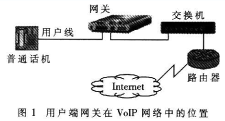 近年來(lái)隨著寬帶網(wǎng)絡(luò)和IP技術(shù)的日益發(fā)展,VoIP>(Volee over Internet Protoc01)技術(shù)的應(yīng)用越來(lái)越廣泛。網(wǎng)關(guān)是VoIP網(wǎng)絡(luò)中的重要設(shè)備,按照應(yīng)用領(lǐng)域可分為電信級(jí)網(wǎng)關(guān)和用戶端網(wǎng)關(guān)。用戶端網(wǎng)關(guān)設(shè)備主要應(yīng)用于小區(qū)和企業(yè),是連接終端電話和IP網(wǎng)絡(luò)的橋梁,主要功能是進(jìn)行語(yǔ)音編解碼、信令處理、VoIP協(xié)議處理和路由協(xié)議處理等。用戶端網(wǎng)關(guān)設(shè)備在VoIP網(wǎng)絡(luò)中的位置如圖1所示?梢钥闯觯W(wǎng)關(guān)處于用戶電話線路部分的末端、IP網(wǎng)絡(luò)部分的起始端。