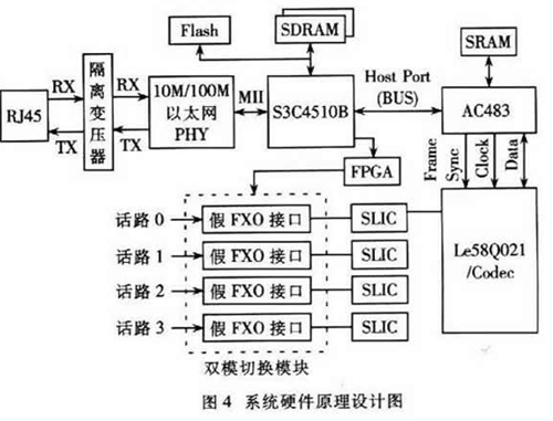 系統(tǒng)的硬件部分主要包括雙模切換模塊、FXS接口電路、語(yǔ)音處理模塊電路、CPU模塊和以太網(wǎng)模塊,硬件設(shè)計(jì)原理圖如圖4所示。