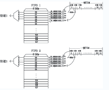 FIFO中的四幀數(shù)據(jù)被讀空時間大于第五幀的第一個字節(jié)寫入FIFO的準(zhǔn)備時間,F(xiàn)IFO的寫滿與讀空都是有硬件產(chǎn)生信號標(biāo)識,此時FIFO讀空信號標(biāo)識未產(chǎn)生,不能對同一FIFO進(jìn)行寫操作,導(dǎo)致待寫數(shù)據(jù)丟失。因此選用兩個FIFO采用乒乓機制來切換讀寫操作,如圖4所示!