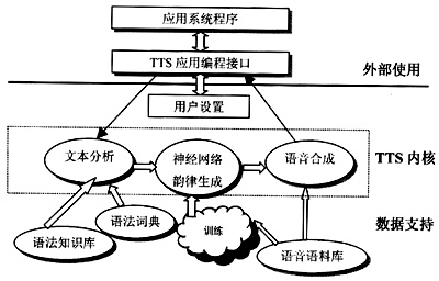 系統(tǒng)的構(gòu)成分為用戶編程接口和TTS內(nèi)核兩大部分。其中,內(nèi)核部分又可按照系統(tǒng)運作的不同過程分為多個子模塊,包含了訓(xùn)練模塊、文本分析模塊、神經(jīng)網(wǎng)絡(luò)韻律生成模塊、語音合成模塊以及與語料庫之間的通信協(xié)議等。同時,系統(tǒng)還考慮了不同類型用戶對TTS系統(tǒng)功能的需要,提供了豐富的編程接口。