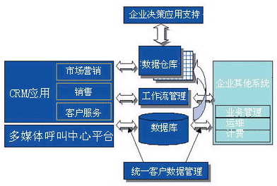 一個完整的客戶關(guān)系管理系統(tǒng)應該包括:多媒體呼叫中心系統(tǒng)、客戶關(guān)系管理應用、統(tǒng)一客戶數(shù)據(jù)管理系統(tǒng)和數(shù)據(jù)倉庫、工作流管理系統(tǒng)和企業(yè)決策應用支持系統(tǒng)。