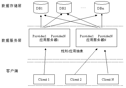 在大規(guī)模系統(tǒng)中,為保證數(shù)據(jù)庫(kù)訪問的效率和安全性,數(shù)據(jù)訪問方式一般采用由Client、中間層應(yīng)用服務(wù)器(或叫規(guī)則服務(wù)器)和Server組成的三層Client/Server結(jié)構(gòu)。將數(shù)據(jù)庫(kù)應(yīng)用劃分為邏輯上的三個(gè)層次,客戶程序只關(guān)心數(shù)據(jù)的顯示與用戶界面;應(yīng)用服務(wù)器處理客戶數(shù)據(jù)查詢與更新請(qǐng)求,可在應(yīng)用服務(wù)器上定義數(shù)據(jù)操作規(guī)則以保證數(shù)據(jù)操作的合法性、安全性與有效性。在三層結(jié)構(gòu)下,方便了軟件的修改和模塊的疊加,客戶端通過應(yīng)用服務(wù)器訪問數(shù)據(jù)庫(kù)服務(wù)器,客戶端并不直接與數(shù)據(jù)庫(kù)服務(wù)器建立連接,從而減輕了數(shù)據(jù)庫(kù)服務(wù)器的壓力,提高整個(gè)應(yīng)用系統(tǒng)的運(yùn)行效率。