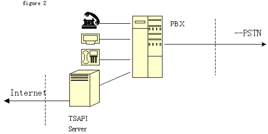 2、TSAPI技術標準:由Novell公司開發(fā)。它將程控交換機或中央電話系統(tǒng)與Netware網(wǎng)絡集成在一起?梢詫崿F(xiàn)呼叫轉移,交互式語音(IVR)和自動呼叫分配(ACD)等功能。支持包括Windows各種版本、OS/2和Unix等目前主要操作系統(tǒng)。不同于TAPI ,TSAPI在計算機和桌面之間建立一個邏輯的連接,通過這些連接在任一端的TSAPI應用就可以完成呼叫控制。由于TSAPI主要為Netware網(wǎng)操作系統(tǒng)增加電話服務,不在每個電話和PC之間建立直接的連接,而是由一個電話服務器Netware可加載模塊(NLM)、一個電話服務器API(TSAPI)、一個電話服務器庫和一個電話客戶庫組組成在服務器電話系統(tǒng)間建立的連接,因此這個連接也稱為PBX-To-Server連接。電話服務器 NLM是負責 PBX和 Netware服務器間傳送信息的。電話服務器 API是為運行于服務器上的應用提供電話服務器API。三方連接在客戶--服務器組網(wǎng)中比單方連接有更大的靈活性。網(wǎng)上的每個用戶都可迅速地通過現(xiàn)有的LAN基礎結構撥入PBX。對其他服務的接入,如主機或終端仿真、傳真、E-mail等,都可以通過CTI接口獲得,只要這些業(yè)務已經(jīng)存在于網(wǎng)上。結構如圖: