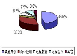 視頻會(huì)議系統(tǒng)在我國(guó)開始發(fā)展的初期,政府部門的應(yīng)用就占據(jù)了重要位置,覆蓋中央到直轄市和各省會(huì)城市的國(guó)家公眾視頻會(huì)議骨干網(wǎng)已經(jīng)完工。自1994年9月投入使用以來,國(guó)務(wù)院等機(jī)關(guān)先后利用該網(wǎng)召開了三百多次全國(guó)范圍的可視通訊會(huì)議。整個(gè)系統(tǒng)運(yùn)行情況良好,得到了國(guó)家領(lǐng)導(dǎo)人和各部委領(lǐng)導(dǎo)的高度贊揚(yáng)。近年來隨著電子政務(wù)工程的逐步推進(jìn),政府部門更加關(guān)注視頻會(huì)議系統(tǒng)建設(shè)。在經(jīng)濟(jì)發(fā)達(dá)地區(qū)(例如浙江、山東、廣東),視頻會(huì)議網(wǎng)已覆蓋到地市級(jí)城市,有的甚至覆蓋到縣一級(jí)。除各級(jí)政府之外,其它諸如檢察院、法院、公安和和水利等職能部門也是視頻會(huì)議系統(tǒng)的重要用戶。如圖1所示,政府辦公已占全部市場(chǎng)份額的46.6%。