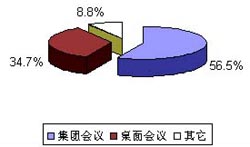 如圖2所示,集團(tuán)會(huì)議終端所占份額為56.5%,桌面會(huì)議終端為34.7%。桌面會(huì)議終端盡管發(fā)展時(shí)間不長(zhǎng),但由于其較好地集成了會(huì)議、數(shù)據(jù)等應(yīng)用,其市場(chǎng)份額也頗為可觀。與集團(tuán)會(huì)議終端相比,近年來增長(zhǎng)較為迅速。