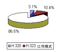如圖5所示,目前僅僅存在少量單一H.320產(chǎn)品,雙模式產(chǎn)品在市場(chǎng)中占據(jù)著主導(dǎo)地位,單一的H.323模式主要由桌面會(huì)議系統(tǒng)占據(jù),市場(chǎng)份額穩(wěn)步增長(zhǎng)。