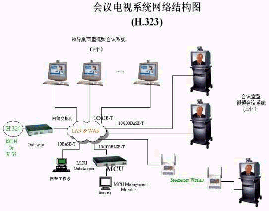 因此,對(duì)于會(huì)議電視系統(tǒng)的建設(shè),我們推薦采用H.323方案。方案的總體結(jié)構(gòu)如下:
