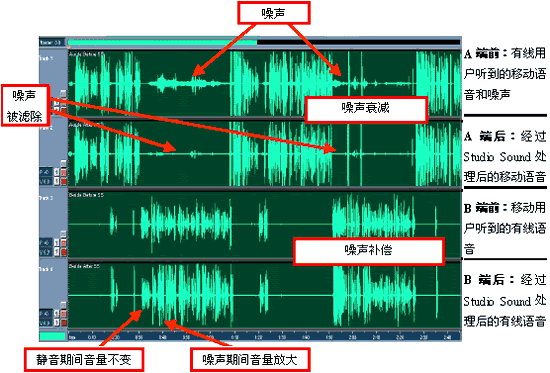 這里的結(jié)果顯示出,PSTN側(cè)收聽器接收到的噪音是如何被大大降低的,同時(shí)PSTN側(cè)說(shuō)話的音量在無(wú)線側(cè)出現(xiàn)大聲的噪音期間被顯著地放大了。通過(guò)遍及全球的類似場(chǎng)合試驗(yàn),在應(yīng)用Studio Sound之前和應(yīng)用之后通話質(zhì)量的不同已經(jīng)深刻為許多業(yè)務(wù)提供商所了解。