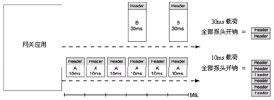 在一個減少發(fā)話方和受話方間音頻反應(yīng)時間的努力中,VoIP網(wǎng)關(guān)通常會配置成發(fā)送較小的語音數(shù)據(jù)載荷。雖然這樣做通?梢詼p少聽得見的傳輸延遲,但同時也增加了一個給定語音數(shù)據(jù)流需要傳遞的包的數(shù)量。因為不管多小的音頻載荷都需要一個固定大小的包報頭,網(wǎng)上需要傳遞的數(shù)據(jù)量越大這個效果越明顯──跟隨的是網(wǎng)絡(luò)包和數(shù)據(jù)流量的相應(yīng)增長。圖1說明了用于傳輸包報頭的帶寬會隨著包載荷大小的縮小而增大。