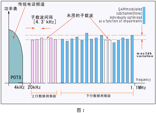DSL技術(shù)是在人們對(duì)高速互聯(lián)網(wǎng)訪問(wèn)需求推動(dòng)下的產(chǎn)物。DSL利用頻率復(fù)用和OFDM調(diào)制技術(shù),在不影響傳統(tǒng)電話業(yè)務(wù)的前提下可以為用戶提供最高達(dá)8Mbps的數(shù)據(jù)傳輸速率。這個(gè)速率是基于POTS的Modem速率(以目前的最高速率56kbps為參考)的140倍;DSL技術(shù)所帶來(lái)的巨大帶寬為家庭和小型公司提供了一個(gè)寬帶數(shù)字業(yè)務(wù)的新平臺(tái)。這個(gè)DSL平臺(tái)可以支持多種寬帶業(yè)務(wù):包括高速I(mǎi)nternet接入、虛擬專網(wǎng)及VOD等流媒體業(yè)務(wù)。其基本原理如下圖1所示:
