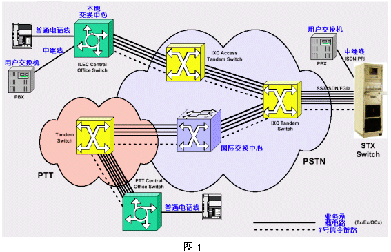 圖1給出了傳統(tǒng)電話網(wǎng)絡(luò)PSTN的組織結(jié)構(gòu)圖。它是目前規(guī)模最大的電話業(yè)務(wù)網(wǎng)絡(luò),通過標(biāo)準(zhǔn)的信令控制網(wǎng)絡(luò)(SS7),成為覆蓋全球的大型電話網(wǎng)絡(luò)。這個(gè)網(wǎng)絡(luò)和Internet互聯(lián)網(wǎng)有著驚人的相似,它們都采用級聯(lián)結(jié)構(gòu),具有易于擴(kuò)展的特性。