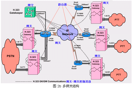 從PSTN來的呼叫被H.323網(wǎng)關(guān)受理,把其中的話音流轉(zhuǎn)換成IP數(shù)據(jù)包經(jīng)過IP網(wǎng)絡(luò)傳到目的網(wǎng)關(guān)下的指定電話終端;同時(shí)受理IP網(wǎng)絡(luò)來的呼叫(可以來自電腦終端或另一個(gè)PTT網(wǎng)絡(luò))轉(zhuǎn)向PSTN目的終端1。