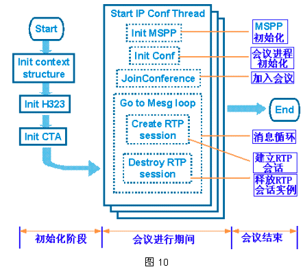 整個IP會議大概過程可以用圖10來說明,各子流程均由MGCP/H.323的相關(guān)API函數(shù)完成。
