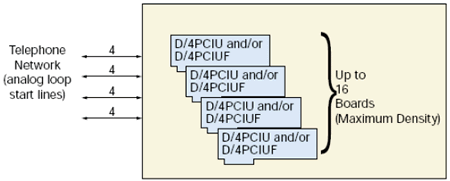D/4PCIU和D/4PCIUF板卡安裝在計算機(jī)里(基于Pentium? 處理器的PC) ,可以提供4到64線的集成的,不使用CTbus總線的語音解決方案。