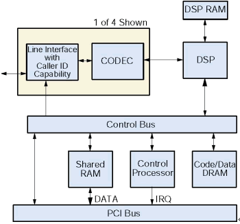 一個板卡上的微處理器控制D/4PCIU和D/4PCIUF通過一個本地總線控制板卡所有操作,它從主機(jī)截獲和執(zhí)行命令。這個微處理器處理實(shí)時的事件,管理和主機(jī)交互的數(shù)據(jù)流,提高系統(tǒng)的反應(yīng)時間,減少主機(jī)處理的需求,傳遞給應(yīng)用程序之前處理DTMF和電話信令,把DSP解脫出來專門做信令處理。這個微處理器和主機(jī)的通信是通過一個共享RAM,它作為一個輸入/輸出緩沖區(qū)增加的磁盤文件傳輸?shù)男。這個RAM和主機(jī)的接口是PCI總線。為了滿足實(shí)時系統(tǒng)的要求,所有操作的是中斷驅(qū)動的。所有安裝在PC里面的D/4PCIUF板卡共享同一個中斷。在系統(tǒng)初始化的時候,固件從主機(jī)下載到板卡上的代碼/數(shù)據(jù)
