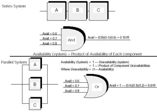 由于冗余被引入系統(tǒng),系統(tǒng)的可用特性發(fā)生了重大的改變。實(shí)用性計(jì)算變成了一種費(fèi)力并且容易出錯(cuò)的工作,因?yàn)橛?jì)算必須考慮冗余的效果,失效切換到冗余組件的成功率,MTTR失效組件的效率及相似的問題。使用平臺(tái)和電話板塊MTTF數(shù)據(jù)作為輸入和使用可靠模塊圖(RBD)2以正確決定系統(tǒng)級(jí)別可用特性可以獲得更好的結(jié)果。