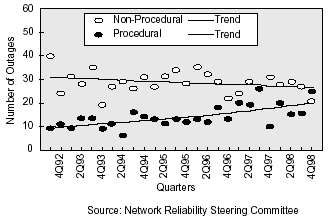 根據(jù)來自網(wǎng)絡(luò)可靠性指導(dǎo)委員會(huì)(NRSC)的研究,對(duì)于33%報(bào)告的業(yè)務(wù)中斷,程序出錯(cuò)是根本原因。程序中斷的頻率有上升的趨勢(shì),正如在右面圖中顯示的那樣。