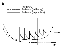 通常,硬件遵循所謂"浴缸曲線"--故障率在系統(tǒng)投入使用的前幾個(gè)月降低,但是在一定時(shí)間后再一次增加。最初的降低是因?yàn)?quot;強(qiáng)化試驗(yàn)",較差的組件失效的相對(duì)較快,而被去除掉。較穩(wěn)定的組件在系統(tǒng)中保留下來。一段時(shí)間后,它們開始變差,最終失效。硬件行為在下面的圖中由點(diǎn)線表示。